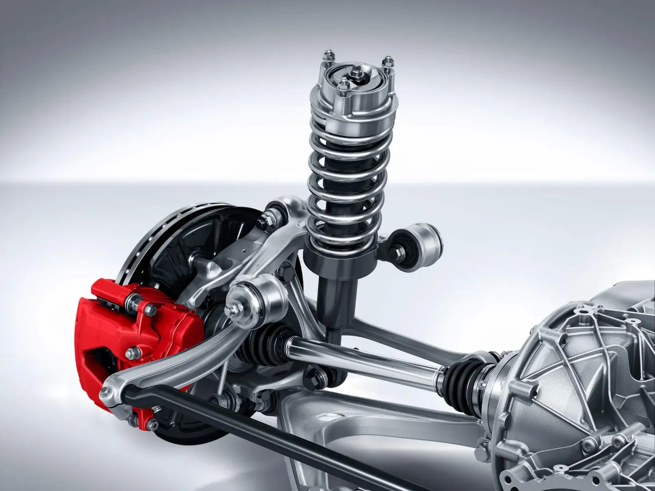 Shock absorbers, struts, control arms, steering racks, and tie rods.